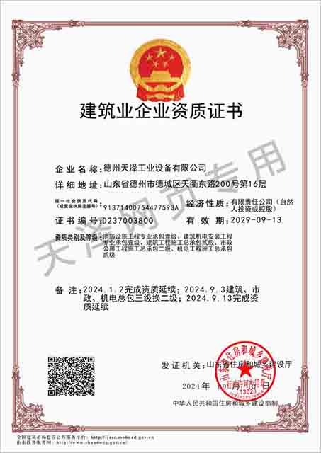 德州天澤工業(yè)設(shè)備有限公司成立于2003年(前身為德州天元集團天明工業(yè)設(shè)備安裝公司),經(jīng)過20多年的發(fā)展,現(xiàn)成長為擁有職工600余人,各類專業(yè)技術(shù)人員近300余人,年生產(chǎn)能力兩億元以上,以建筑機電安裝工程、消防設(shè)施安裝工程施工為主,集建筑工程施工、市政工程施工、建筑智能化工程施工、園林綠化工程施工、工程管理服務、物業(yè)管理、電氣機械設(shè)備銷售等多元化經(jīng)營于一體的綜合型企業(yè)。2005年,企業(yè)按照國際標準建立的質(zhì)量管理體系,通過了ISO質(zhì)量管理體系認證、環(huán)境管理體系認證、職業(yè)健康安全管理體系認證。施工工程遍布山東、河北、四川、江蘇等地,最具代表性的工程有:山東省德州市百腦匯資訊廣場機電安裝工程、德州經(jīng)濟開發(fā)區(qū)天元大廈機電安裝工程、陵城區(qū)人民醫(yī)院機電安裝工程、德州金魯班大廈機電安裝工程、河北故城金辰小區(qū)機電安裝工程、北川地震災后援建工程等。多年來,公司始終堅持“以人為本,建精品工程,創(chuàng)行業(yè)品牌”的經(jīng)營理念,先后榮獲省(市)級泰山杯、天府杯、魯安杯等獎項,申報各種功法、多項專利。